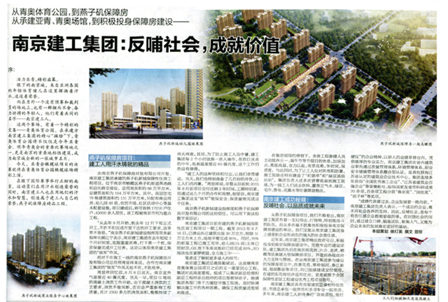 《南京日報》對南京建工集團燕子磯新城保障房項目進行專題報道 2013年8月19日,《南京日報》A3版以《南京建工集團:反哺社會,成就價值》為題,從集團承接青奧體育公園項目到承建民心工程,對南京建工集團燕子磯保障房項目建設(shè)情況進行了系統(tǒng)報道。 近年來,集團先后在南京雨花臺、六合、玄武、棲霞等區(qū)承建大型保障房項目,受到各級政府大力支持與贊揚。在參建的保障房項目中,西善花苑、翠嶺銀河、春江新城、福潤雅居等項目,均已陸續(xù)建成交付使用。在建的東花崗經(jīng)濟適用住房項目,獲全國保障性安居工程建設(shè)優(yōu)秀工程項目稱號。 作為南京市主流媒體的《南京日報》再次對集團燕子磯保障房項目進行專題報道,是對“南京建工集團”品牌形象的高度肯定。