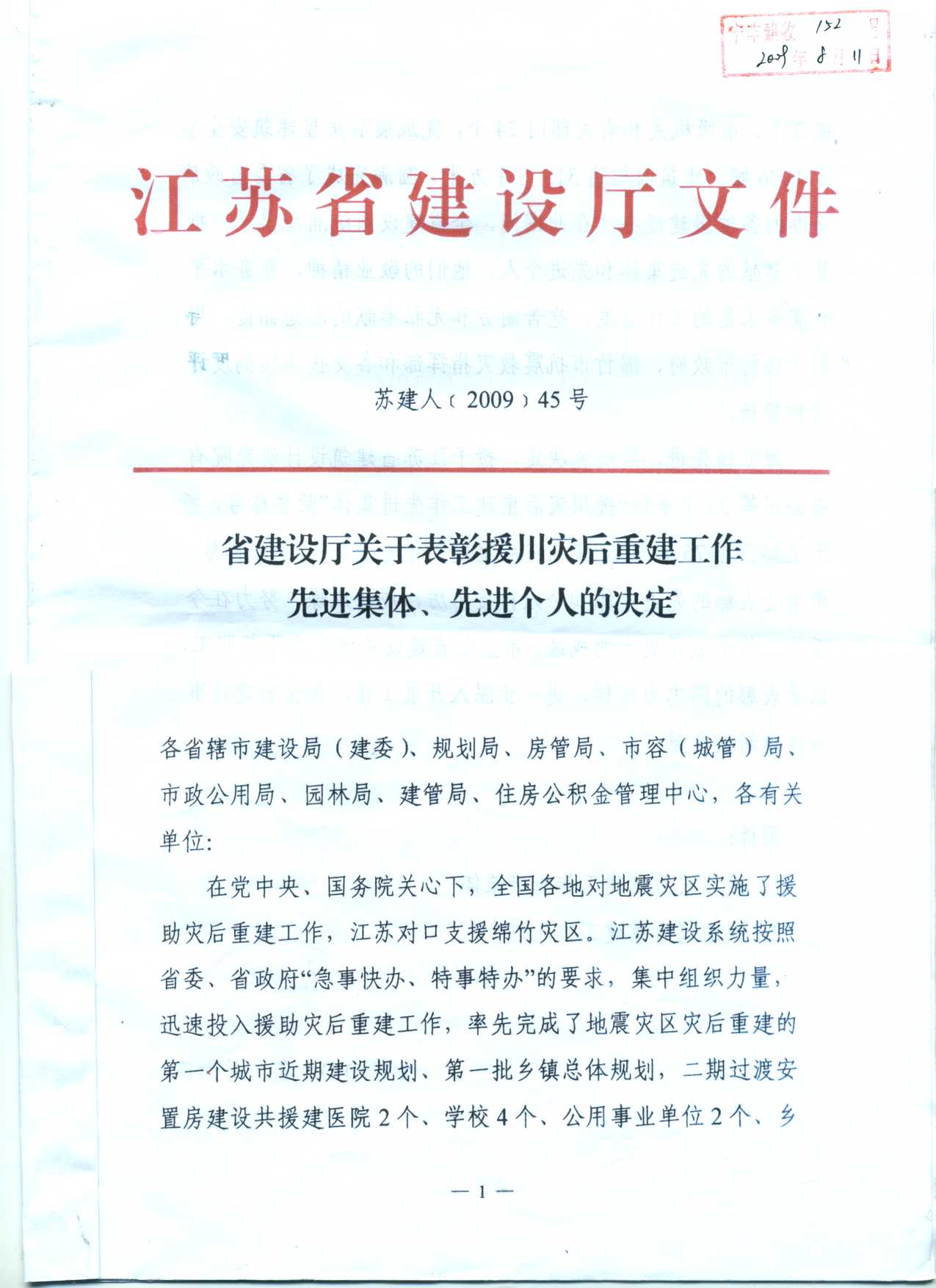 南京建工集團(tuán)被評(píng)為江蘇省建設(shè)廳“援川災(zāi)后重建工作先進(jìn)集體”