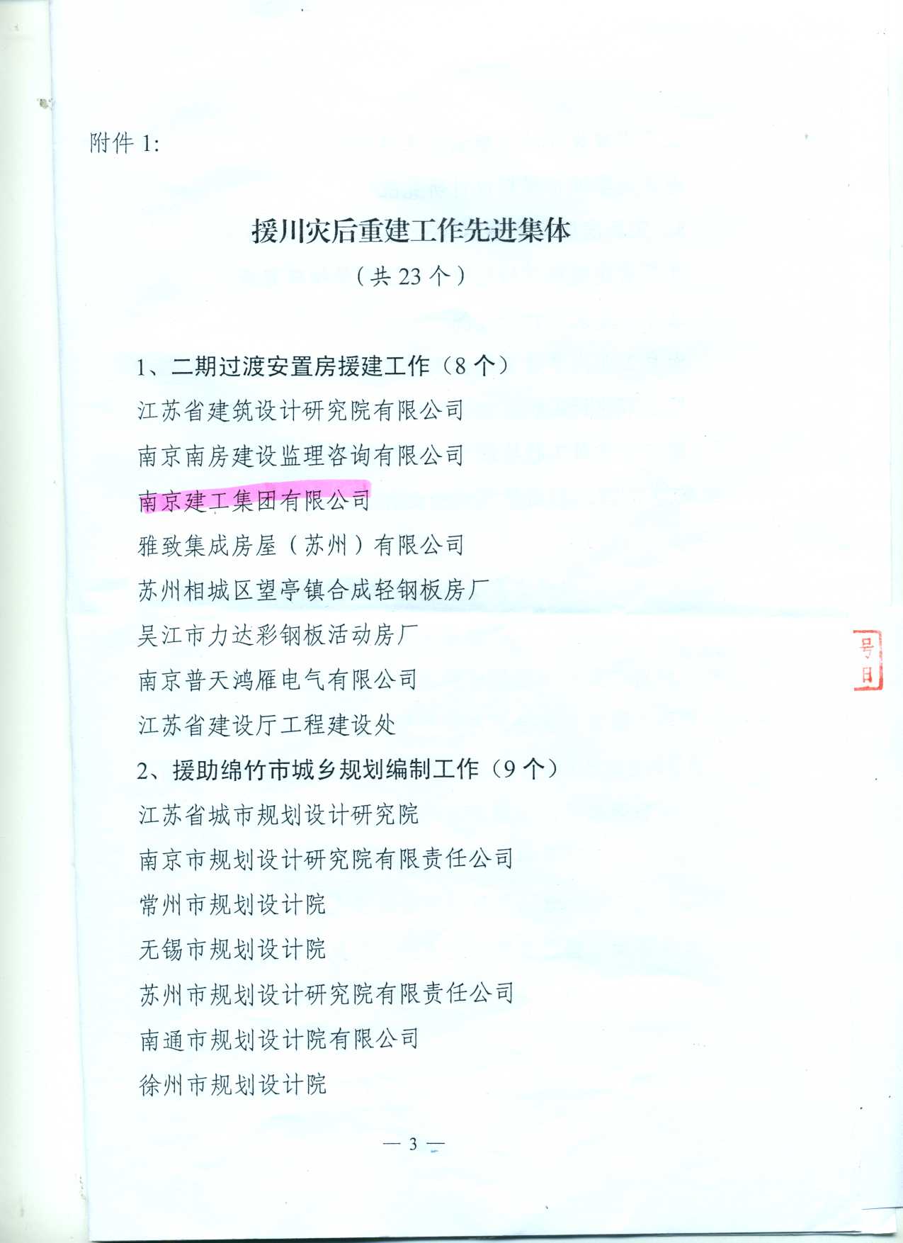 ? 南京建工集團(tuán)被評(píng)為江蘇省建設(shè)廳“援川災(zāi)后重建工作先進(jìn)集體”