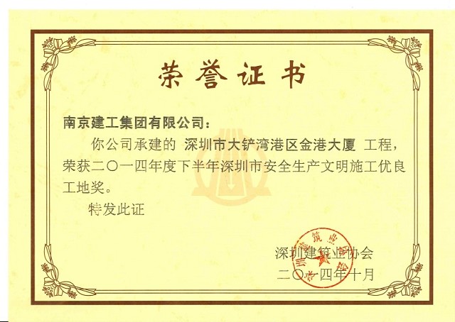 南京建工集團(tuán)深圳金港大廈榮獲深圳市安全生產(chǎn)文明施工優(yōu)良工地獎(jiǎng)