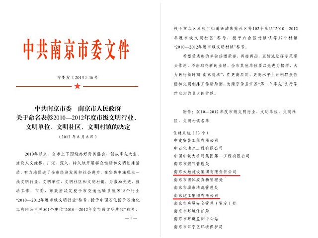 南京建工集團喜獲2010-2012年度南京市文明單位近日,中共南京市委、南京市政府命名表彰2010-2012年度市級文明行業(yè)、文明單位、文明社區(qū)、文明村鎮(zhèn),南京建工集團作為南京市住建系統(tǒng)僅有的兩家非公企業(yè)之一,榜上有名,這是對企業(yè)健康科學發(fā)展、文明創(chuàng)建成績的高度肯定。
