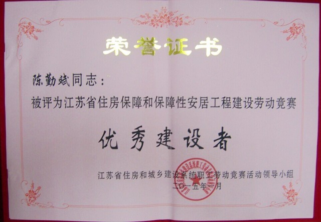 2015年3月,在江蘇省住建系統(tǒng)表彰活動中,南京建工集團(tuán)燕子磯新城保障性住房項目被評為全省住房保障和保障性安居工程建設(shè)勞動競賽優(yōu)秀工程項目;集團(tuán)總裁陳勤斌被評為全省住房保障和保障性安居工程建設(shè)勞動競賽優(yōu)秀建設(shè)者;集團(tuán)副總裁樊淑清被評為省重點工程勞動競賽有功個人。