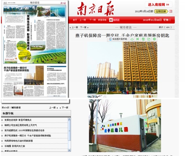 2016年1月6日,南京日報(bào)A4《城建版》刊登了以“燕子磯保障房一期建成交付,上千戶家庭喜領(lǐng)新房鑰匙”為題的文章,對集團(tuán)承建的燕子磯保障房一期工程按計(jì)劃竣工交房及相關(guān)信息進(jìn)行報(bào)道。文章中強(qiáng)調(diào)了燕子磯保障房項(xiàng)目是我市城北規(guī)模最大的保障房片區(qū),也是我市“十二五”規(guī)劃的重點(diǎn)民生工程,突出體現(xiàn)了南京建工集團(tuán)勇挑重?fù)?dān),按計(jì)劃、按節(jié)點(diǎn),向市民交付滿意工程的壯舉。