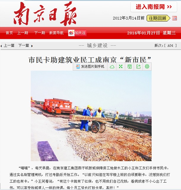 1月27日,南京日報A4版《城市建設(shè)》專欄刊登了題為《市民卡助建筑業(yè)民工成為南京“新市民”》的文章,對以南京建工集團為代表的南京市建筑業(yè)、施工業(yè)實行項目工人市民卡實名制管理制度進行了報道。