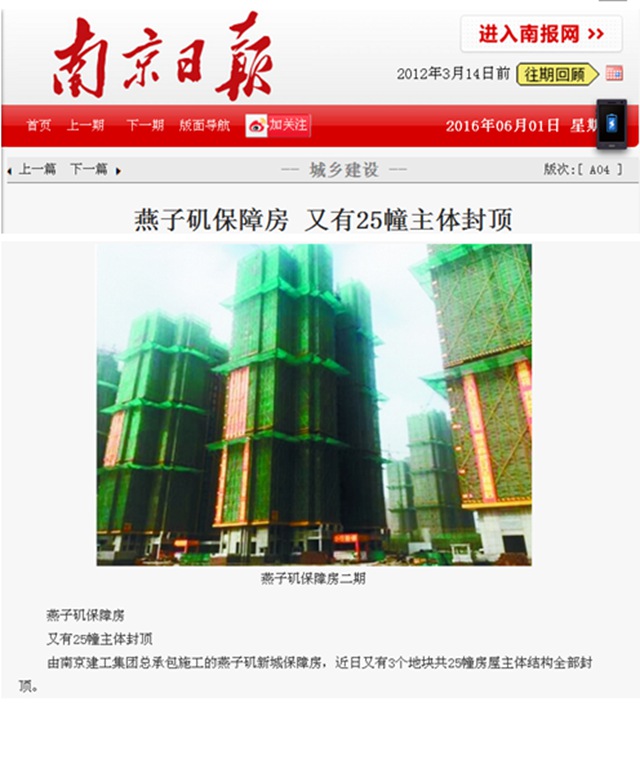 6月1日,《南京日?qǐng)?bào)》A4城鄉(xiāng)建設(shè)版,以“燕子磯保障房又有25幢主體封頂”為題,再次對(duì)集團(tuán)燕子磯新城保障房項(xiàng)目建設(shè)情況進(jìn)行報(bào)道。